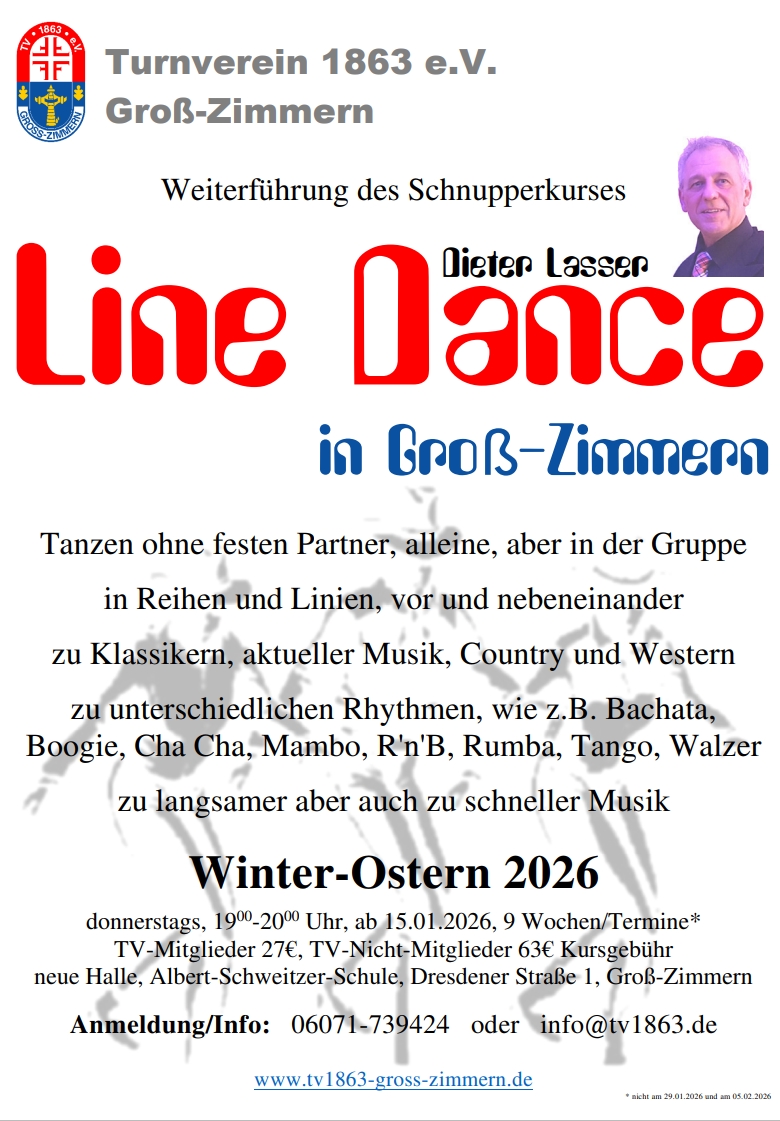 Getanzt wird neun Wochen lang jeweils donnerstags von 19.00 bis 20.00 Uhr in der neuen Turnhalle der Albert-Schweitzer Schule in Groß-Zimmern. Mitmachen kann jede(r), die/ der Lust und Laune an Bewegung und Spaß an einem gemeinsamen Tanzerlebnis hat. An Feiertagen wird der Kurs nicht angeboten, er schiebt sich entsprechend nach hinten… Info vorab: am 29.01.2026 und 05.02.2026 findet kein Kurs statt – er verlängert sich entsprechend nach hinten. Anmeldungen werden ab sofort gerne über die TV Geschäftsstelle entgegengenommen (Mail: info@tv1863.de; oder Tel.: 06071-739424). Hier werden auch gerne Fragen dazu beantwortet. TV Mitglieder zahlen eine Kursgebühr von 27,- €, für TV-Nicht-Mitglieder beträgt die Kursgebühr 63,-€. Wir freuen uns auf euch!! Euer TV Team!