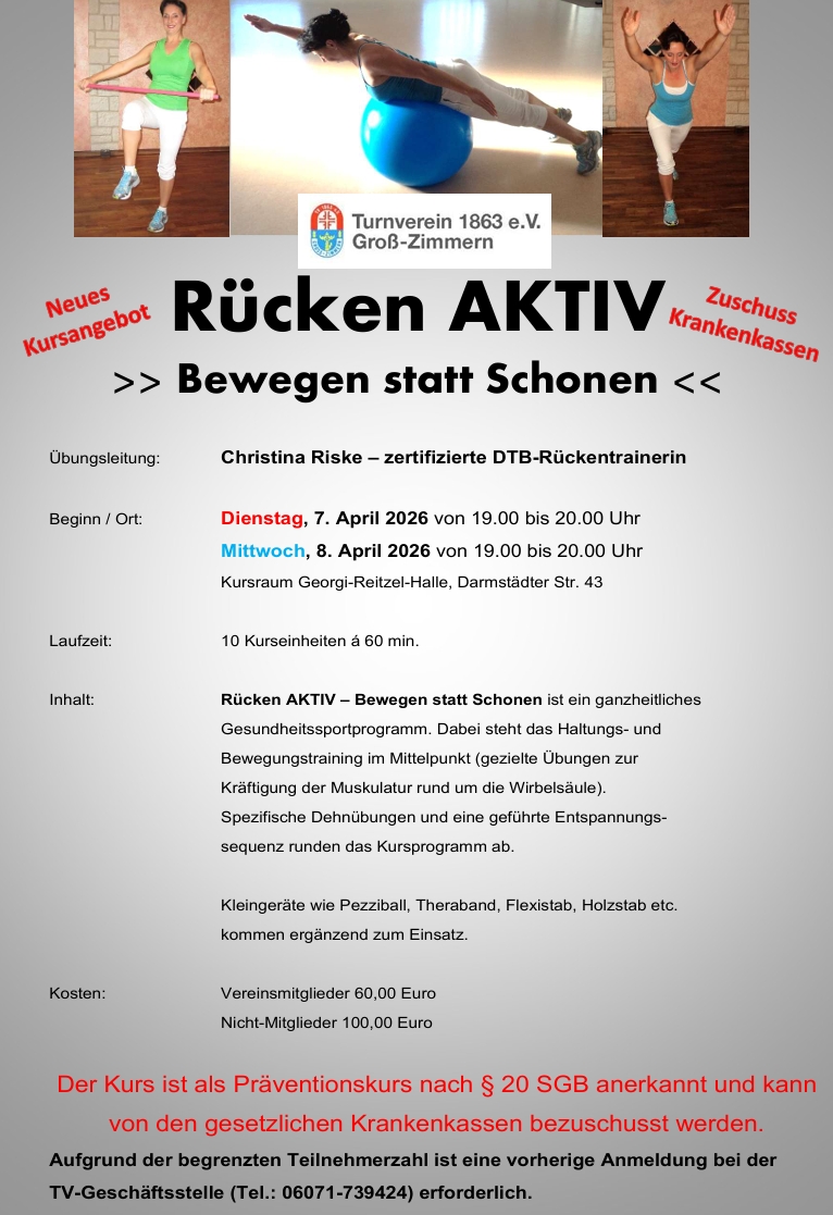 Trainiert wird von 19 Uhr bis 20 Uhr über 10 Einheiten a´ 60 Minuten im Kursraum der Georgi Reitzel Halle. Nach dem Motto „Bewegen statt Schonen“ leitet unsere zertifizierte DTB-Rückentrainerin Christina Riske den Kurs. Die Anmeldung ist ab sofort über die TV-Geschäftsstelle möglich. Sie erreichen uns zu den Öffnungszeiten per Telefon unter 06071-739424 oder jederzeit per Mail an info@tv1863.de.