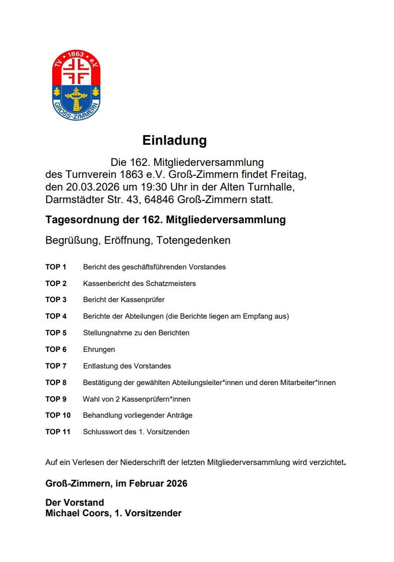 Hier die Tagesordnung für die 162. Mitgliederversammlung: